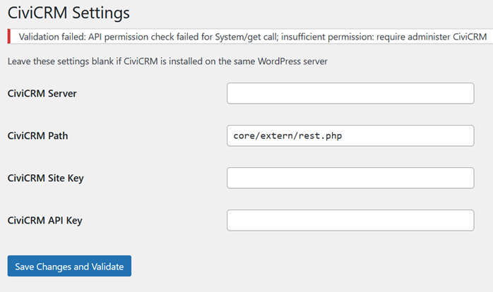 Find the “Form Processor” contact in the web interface and generate an API key there, then copy this key and the Site Key (which is also shown on the API Key tab) to the site where the form is hosted. If you are using the Contact Form 7 CiviCRM integration plugin in WordPress, the path to use is core/extern/rest.php. Note that this is a very old plugin and the “Validation failed” warning is incorrect – “administer CiviCRM” permission is NOT required. Also note my comment above about the configuration file being in the wrong place and the need to create a copy or a symlink for this to work.